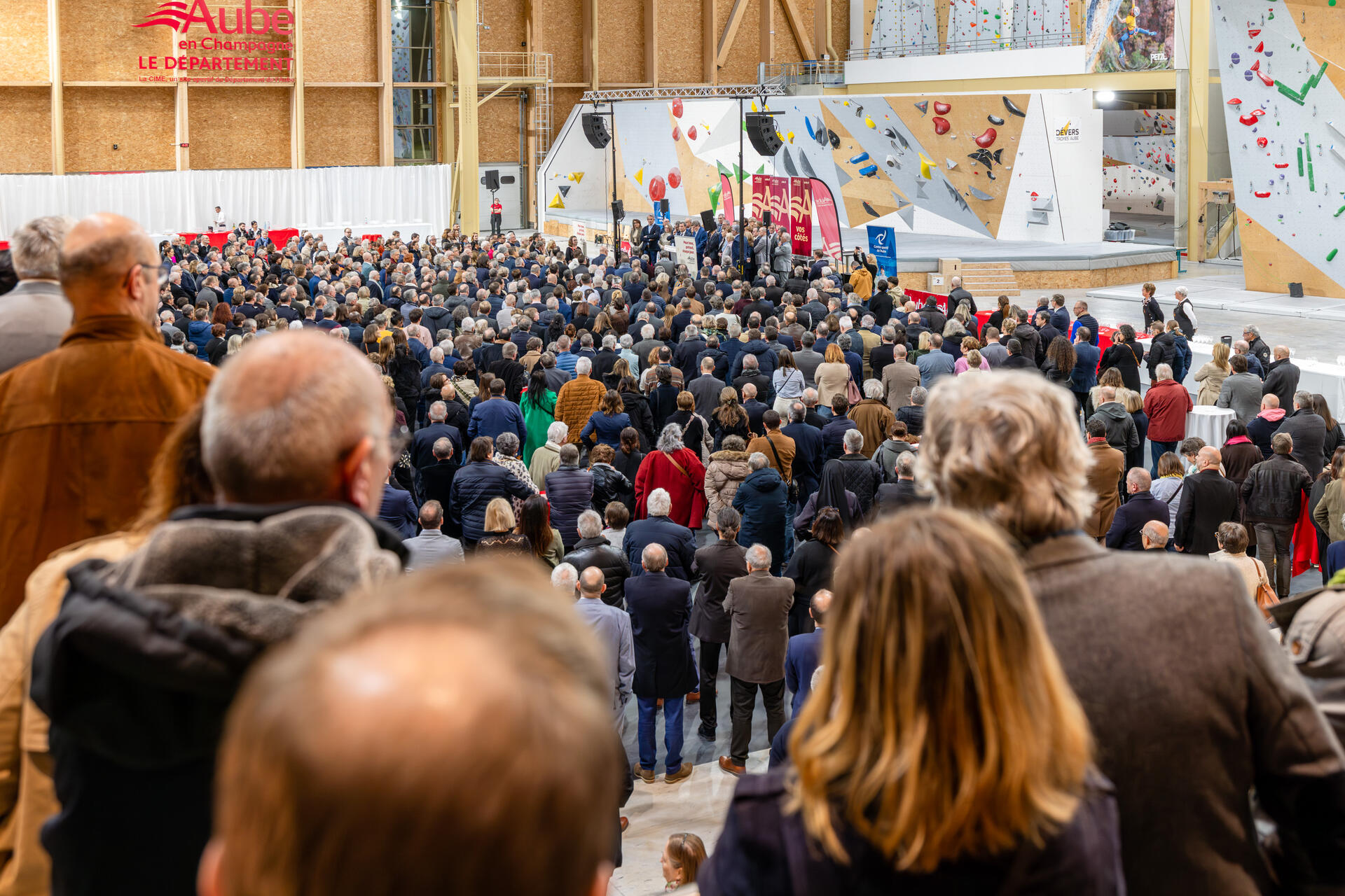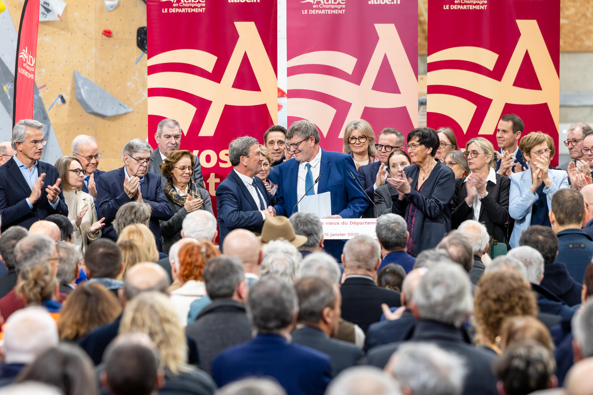 Philippe Dallemagne, président du Département de l'Aube, a présenté jeudi 15 janvier 2026 ses vœux aux maires et aux forces vives de l'Aube, aux côtés des conseillers départementaux, lors d'une cérémonie organisée à la CIME (Complexe international multisport - escalade).